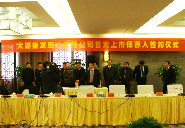 ?? 2012年12月9日,太湖集友紙業(yè)有限公司在皖府國(guó)際大酒店隆重舉行首發(fā)上市保薦人簽約儀式,為尋求企業(yè)更大的發(fā)展空間邁上了新征途。