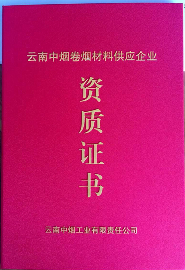 熱烈祝賀我公司榮獲云南中煙卷煙材料供應企業資質A級證書